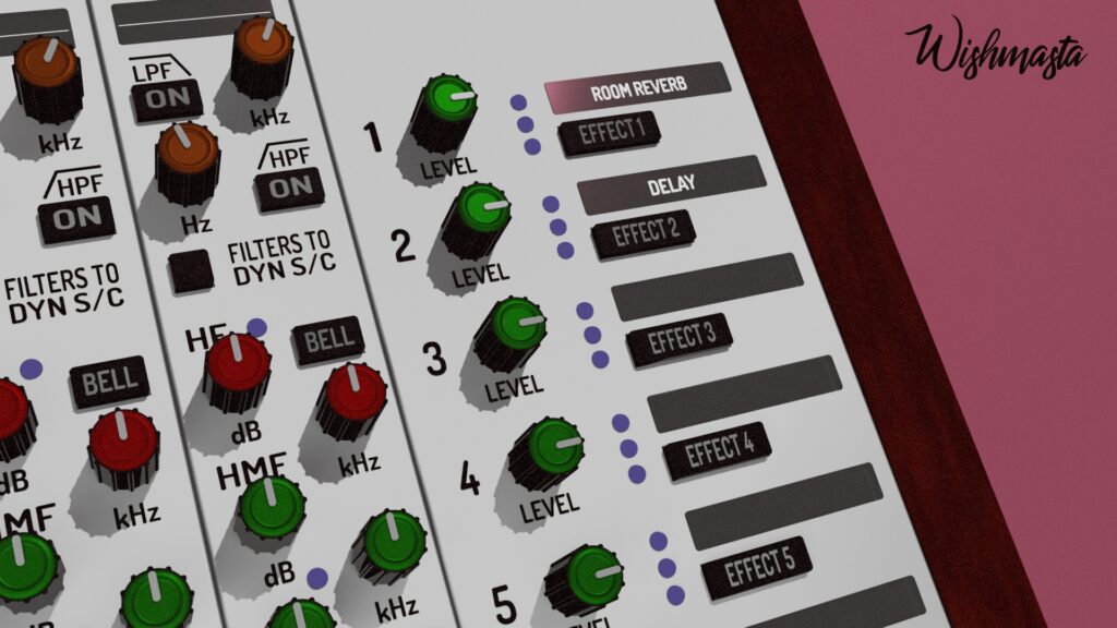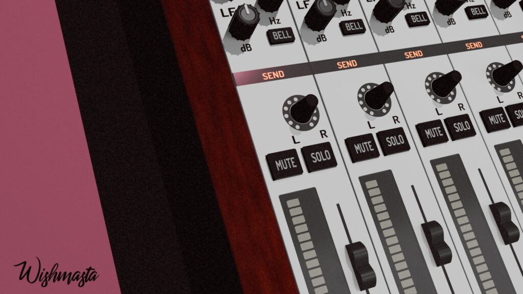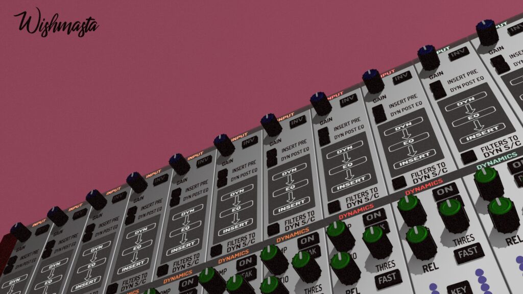 A 3D model of a mixer in the style of Reason Studios, with elements of the aesthetics of the anime "Akira" and Golden Hip-Hop.